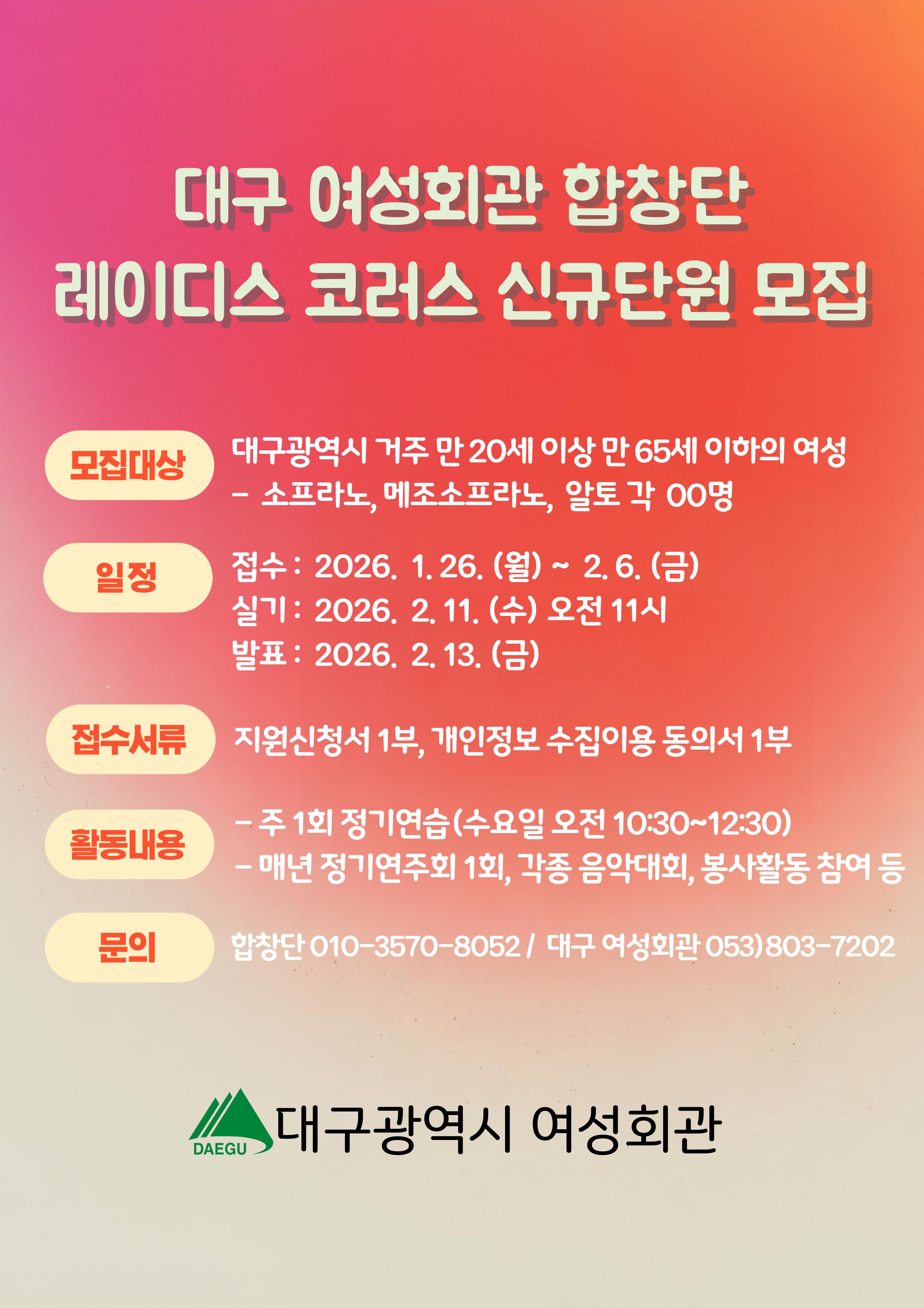 「대구광역시 여성회관 합창단 대구레이디스코러스 신규 단원 모집」 안내